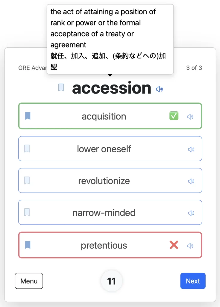 クイズ形式で答えていき、間違えた単語や、自信がない単語を日本語と英語の定義とともに何度も反復学習することで、確実に語彙力が向上して英文読解の解像度が格段に高くなることが期待できます。